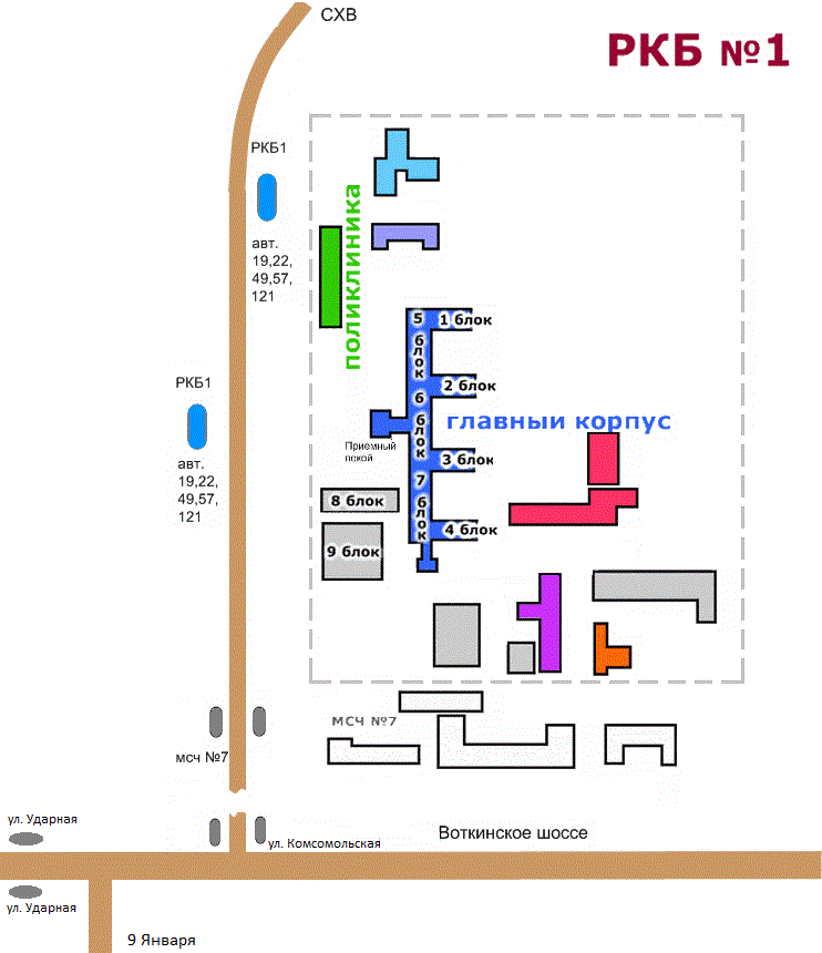 Ижевск, ул. Воткинское шоссе, 57 . Стационар (главный корпус, на схеме синим цветом), хирургический блок, 9 этаж, ЛОР-отделение